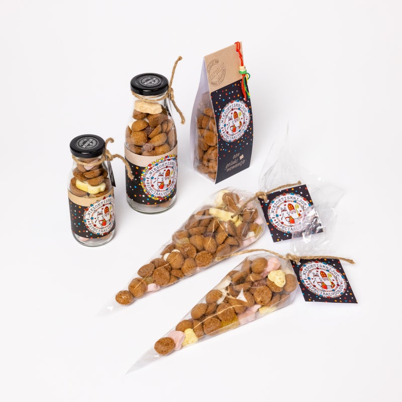 Een compleet assortiment met vrolijke illustraties. Het assortiment bestaat uit blikjes, flesjes, flessen, zakjes chocolade en postgroeten.